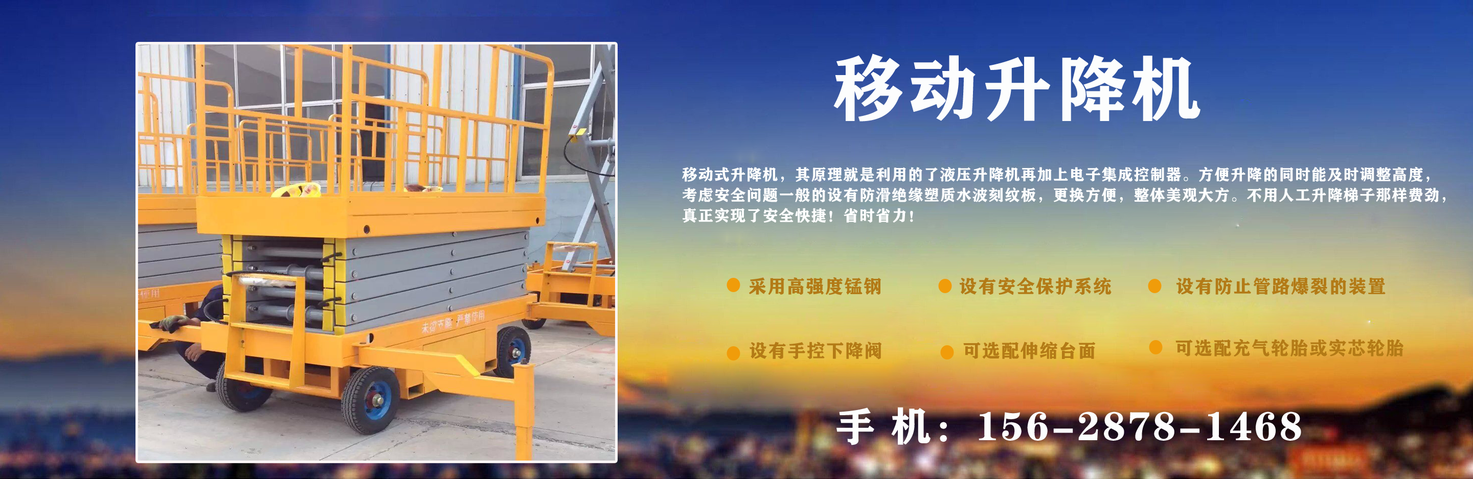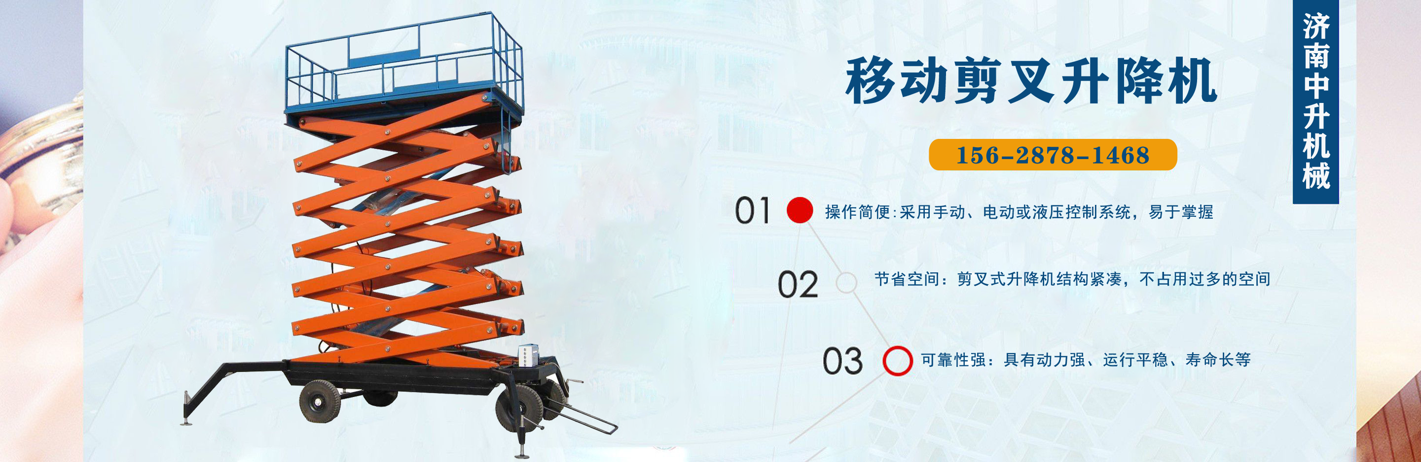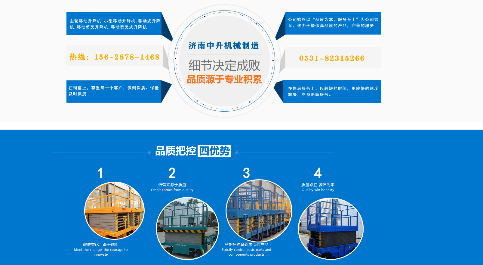 濟南中升機械制造有限公司主營移動升降機,小型移動升降機,移動式升降機,移動剪叉升降機,移動剪叉式升降機等產品,信譽良好,歡迎前來咨詢訂購! 在銷售上,尊重每一個客戶,做到保質、保量及時供貨;在售后服務上,以較短的時間,用較快的速度解決,終身追蹤服務?! 」臼冀K以“品質為本,服務至上”為公司宗旨。致力于提供高品質的產品,完善的服務,快捷的供貨,無論您身處何方,都能感受到我們的優(yōu)良服務??蛻糁辽希\信為本?! g迎各界朋友來電,來函垂詢,選購!...
